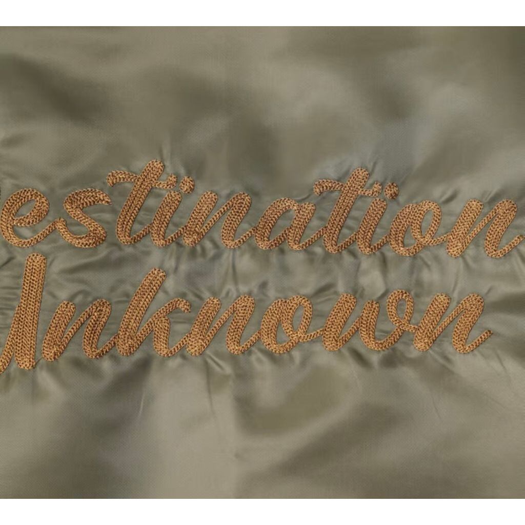 左胸にはLIBERAIDERSのベルクロワッペンが付いており、背中にはDESTINATION UNKNOWNのチェーン刺繍が入ります。