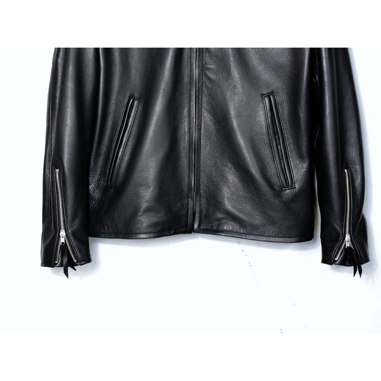 顔料や余計な薬品を一切使用してないので革の銀面に小傷、色ムラが生じる事があるが、それ以上に 顔料仕上げでは表現できない水染め独特のオイルがしっかり入ったしっとりした肌触りと着心地の良いレザージャケットです。