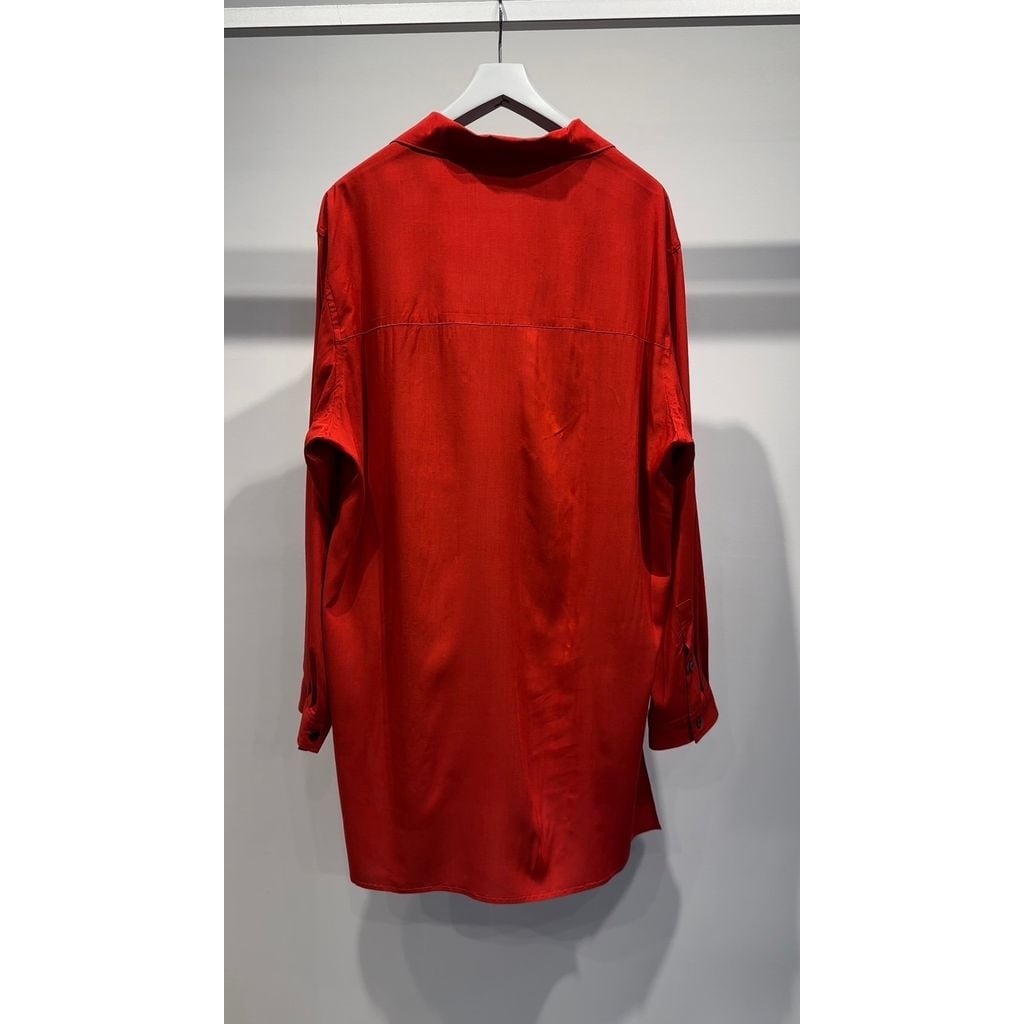 程よい抜け感のある開襟と、並行切り替えの胸元ポケット、袋布に施されたたたきステッチがデザインのさりげないアクセントになっています。柔らかな風合いと美しいドレープ感が魅力のレーヨンローン生地の鮮やかな赤色は、別注色として京都の染工場で無地染加工を施し仕上げています。