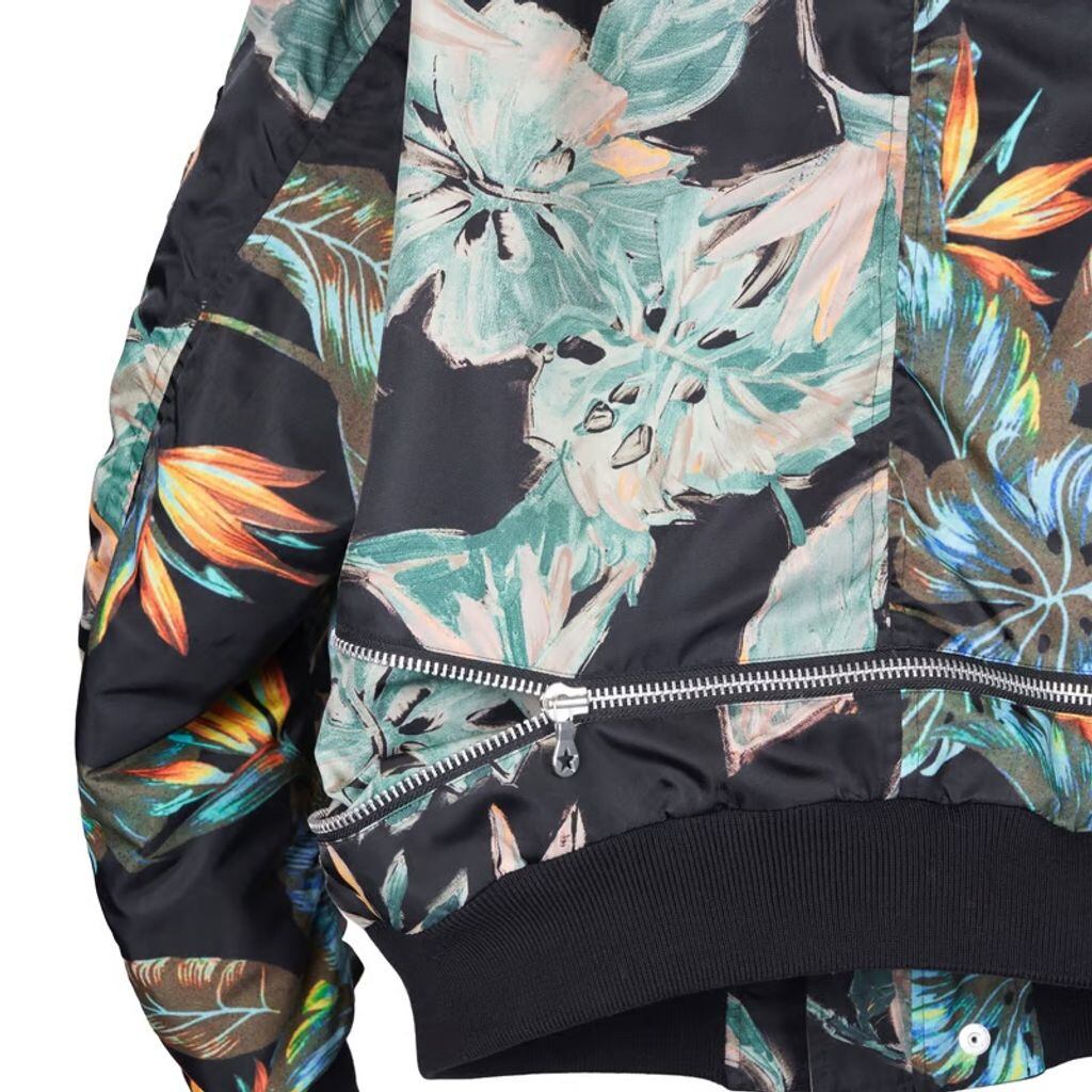 ファスナーを閉じることで着丈をクロップドへ変化させて着用が可能な仕様となっている。また、同仕様の全面ボタニカル柄プリントのナイロン素材のモデルもラインナップ。身幅にゆとりのあるシルエット。