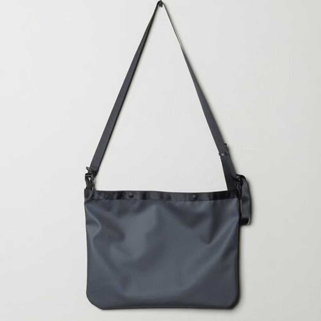 撥水加工のかかったのウレタンコーティングしたナイロンオックス素材を使用したショルダーバッグ。取り外し可能なストラップ。外したバックル同士を繋ぐとロールトップ仕様に。A4サイズ