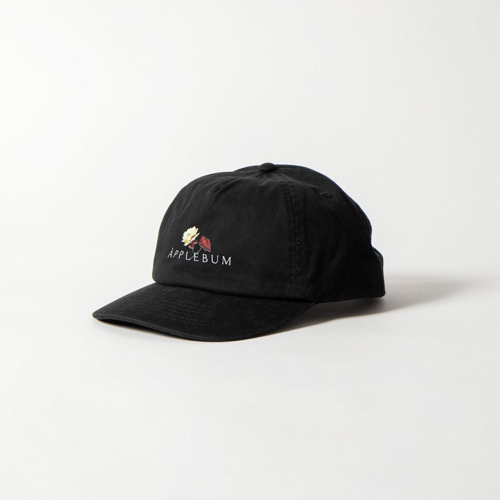 フラワーと【APPLEBUM】ロゴをプリントしたキャップ。