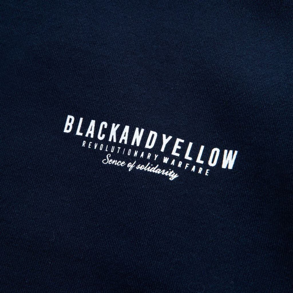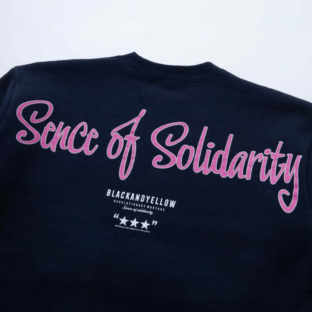 左胸にBLACKANDYELLOWのレターグラフィック、背面にはアウトラインを縁取りした大ぶりなSense Of Solidarityのメッセージグラフィック、その下にレターグラフィック・3連スターをラバープリントで表現したデザイン。襟・袖・裾のリブは硬仕上げが成されており、脇下から体に沿う様に計算された縦のラインが綺麗なレギュラーフィットシルエット。