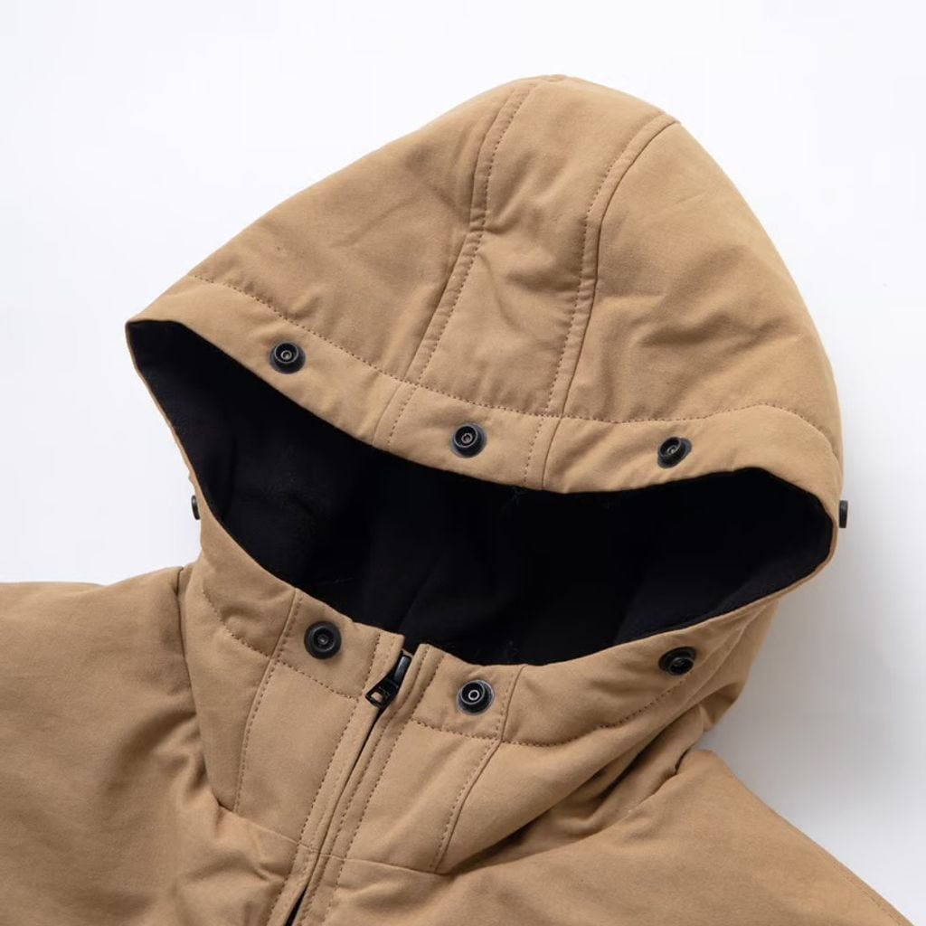 身頃にコットン/モダクリルの混紡難燃素材を使用したミリタリーフーデッドジャケット。両腕の切り替え箇所は耐久性に長けたコードレーン素材。フードに着脱可能なリアルラクーンのファーを付属、左胸にネームタグを叩きつけ、左肩に台座付きサークル型ワッペンを千鳥縫い、両脇に大ぶりなフラップポケット、裏地左側に内ポケットを配置したデザイン。袖口は隠しリブ仕様、身頃裏地は中綿入りキルティング、フード裏はマイクロフリースを採用。身幅にややゆとりのあるシルエット。1色5サイズ展開。