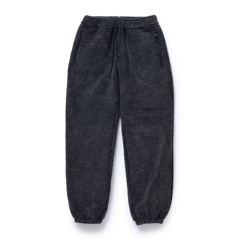 ポリエステル/アクリルの混紡ボア素材を使用したフリースイージーパンツ。裏地に中綿入りキルティングを使用し、防風、防寒性の高い仕様。