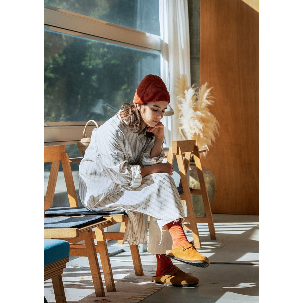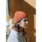 和紙の糸とリサイクルコットン糸の撚糸を使用した、程よいシャリ感が心地よい3シーズン(春~秋) 対応のビーニー。通常の1回折りとショートタイプの2回折りができる2WAY 仕様です。ソックスの技術を応用し、ストレッチ糸を一緒に編み込むことで適度なフィット感と型崩れしにくい生地に仕上げました。「ホールガーメント」という編み機で編み立てているので、縫い代のアタリがなく、頭の形に綺麗にフィット。無縫製のため裁断ロスを削減できるのもポイントです。