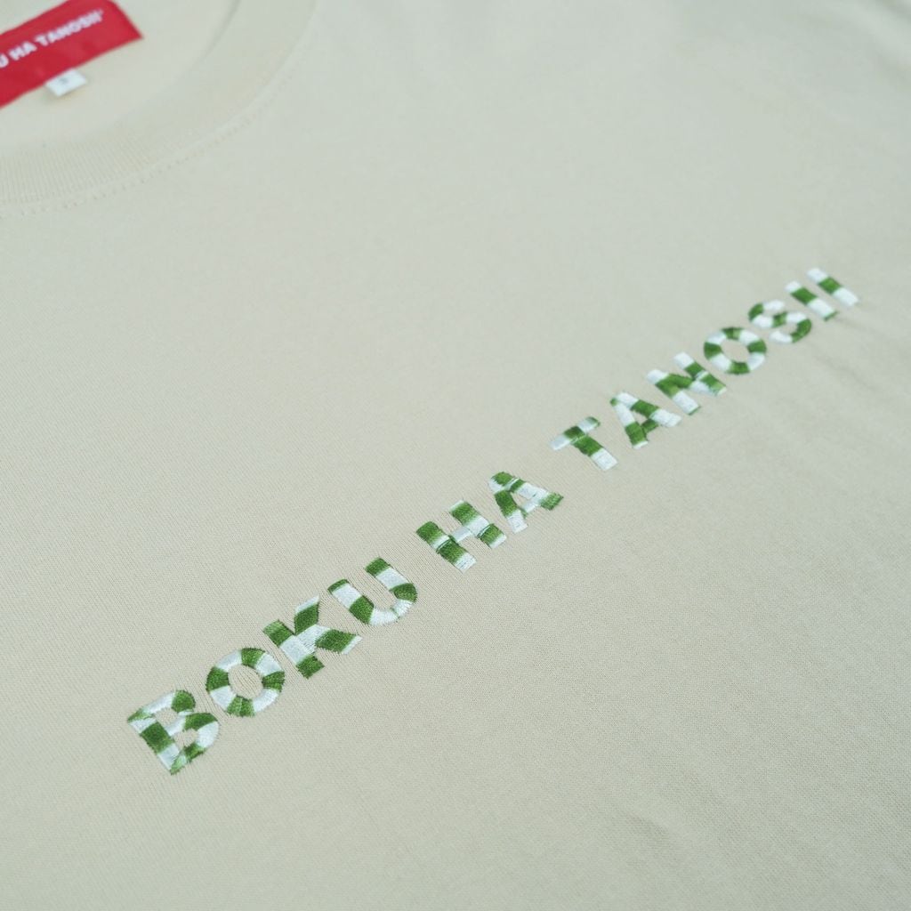 サンドベージュボディにマーブルカラーの刺繍で施されたBOKU HA TANOSII